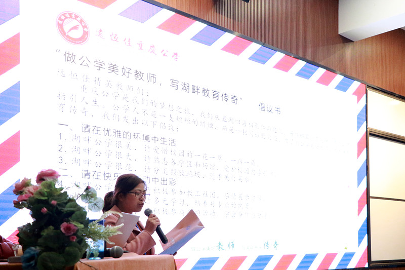接著,湖畔書院院長助理劉莉老師宣讀“做公學(xué)美好教師,寫湖畔教育傳奇”的倡議書,遠(yuǎn)恒佳精英教師們不是一支短短的蠟燭,而是一把閃耀的火炬,立志帶領(lǐng)莘莘學(xué)子在優(yōu)雅的環(huán)境中生活,在快樂的活動(dòng)中出彩,在多元的文化中成長,在高端的平臺(tái)上進(jìn)步,在正確的選擇后奔跑,在溫暖的交往中育人。