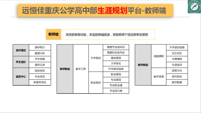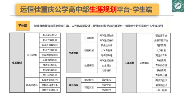 從高一到高三為每個孩子制定詳細的生涯喚醒、生涯探索、生涯決策等方案,根據(jù)大數(shù)據(jù)量身定制個性化生涯規(guī)劃。